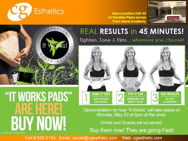 CG Esthetic has a new products and service , called ” IT WORKS” made with Natural herbs. It helps you lose inches by tightening, toning and firming your skin. You can use It works wraps on any part of your body. Carole will be doing a will have a demonstration on Monday at 6 at her shop located in Fairdale Plaza on Coconut Drive.